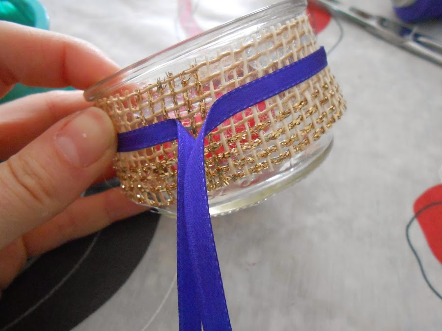 Para decorar con tela de arpillera, cortamos un trozo que quede en el centro del tarro. Si no tenéis tela de arpillera, también vale que uséis lazo extraancho.