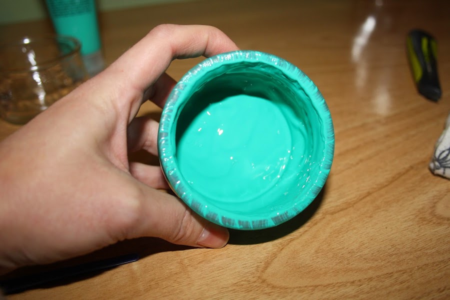 Vertemos un poco de pintura acrílica dentro del tarro de vidrio y vamos extendiéndola por todo su interior. Hay que tener paciencia para rellenar todo el fondo así que lo haremos dando golpecitos en el tarro en todas las direcciones.