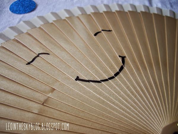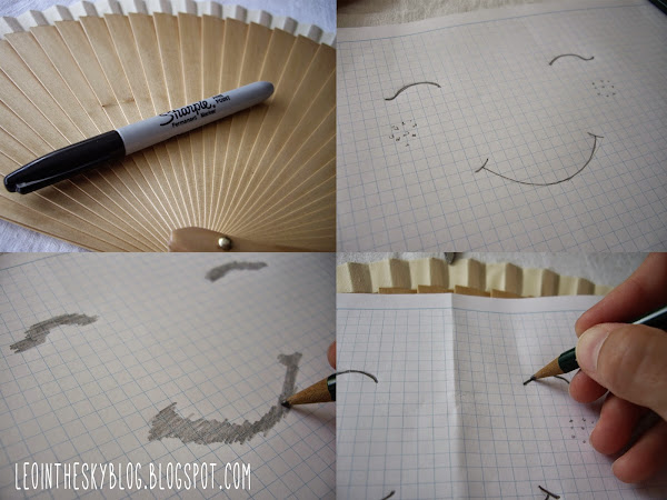 Para el abanico grande sólo utilicé el rotulador. Primero dibujé en una hoja cuadriculada los ojos y la boca, luego le di la vuelta al papel para pasar el lápiz como se ve en la foto y luego puse el diseño sobre el abanico más o menos centrado y lo repasé de nuevo con el lápiz para que se calcara.