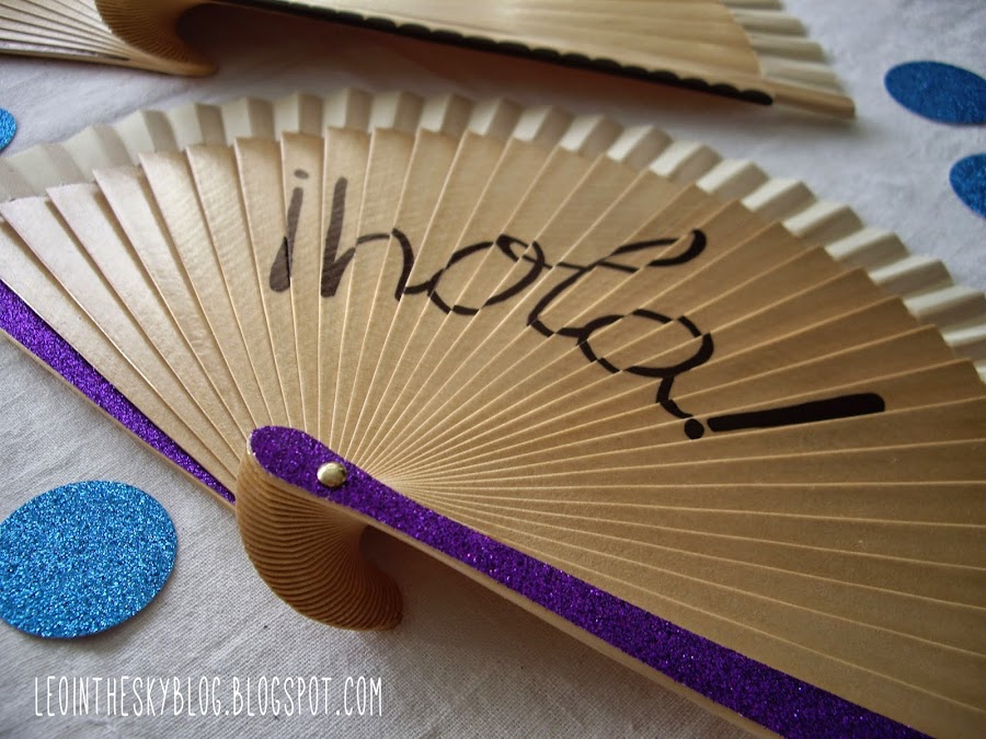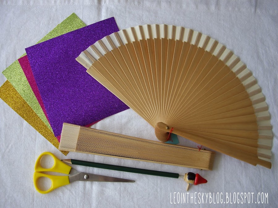 He utilizado un par de abanicos, uno normal (de 23cm de largo) y otro pequeño (de 19cm de largo, perfecto para meter en un bolso pequeño) ambos comprados en un bazar chino, un rotulador permanente, papel adhesivo de purpurina (yo lo compré en Tiger), tijeras, cúter y lápiz.