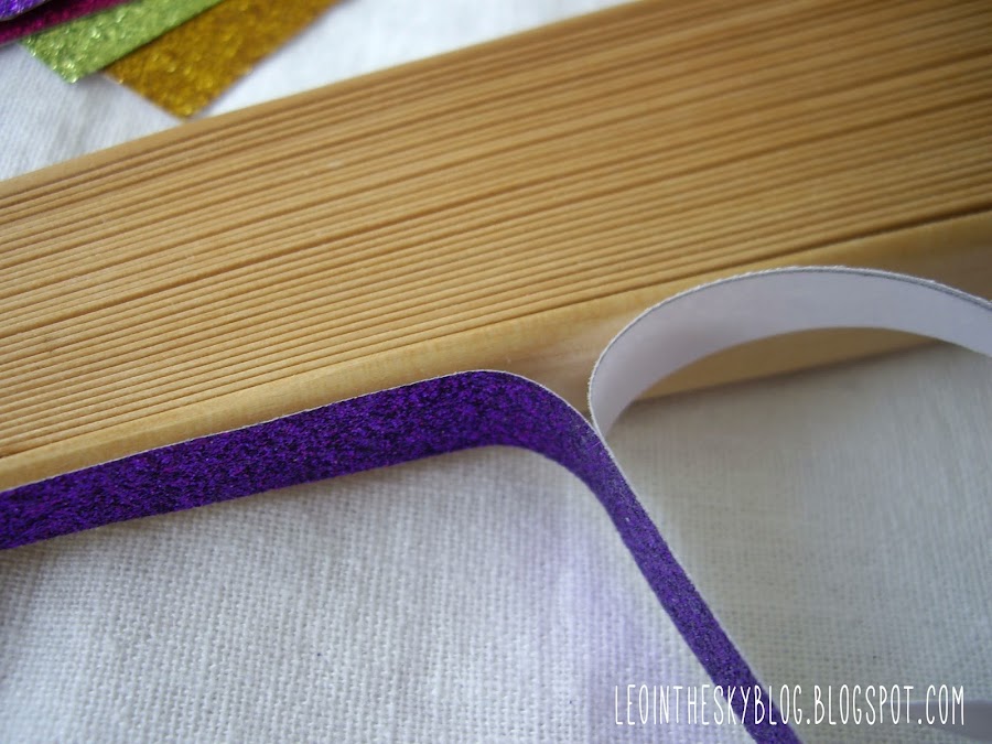 Usando uno de los bordes del abanico como plantilla marcamos alrededor con un lápiz sobre el papel de purpurina, recortamos la forma y como es adhesivo lo pegamos al abanico. Para sortear el tornillo que une las piezas del mismo, hacemos un pequeño corte en cruz con un cúter e introducimos con cuidado el tornillo a través del papel antes de adherirlo al abanico.