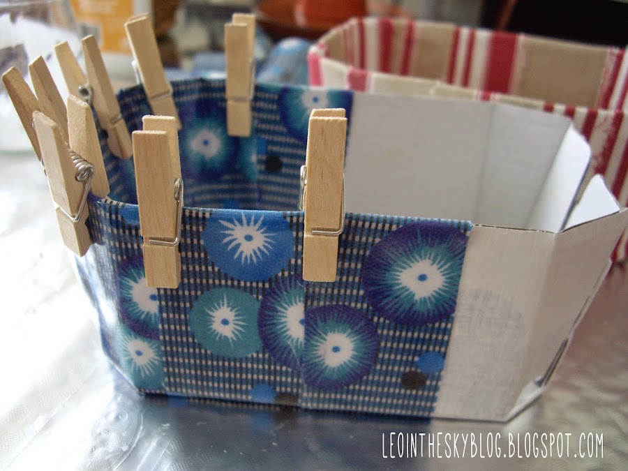 En esta usé una tela plastificada (es la misma que utilicé para hacer un neceser) y tuve que sujetarla con unas pinzas mientras secaba la cola para que no se desprendiera: