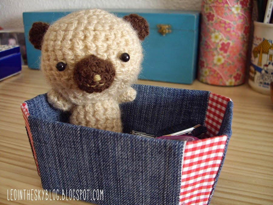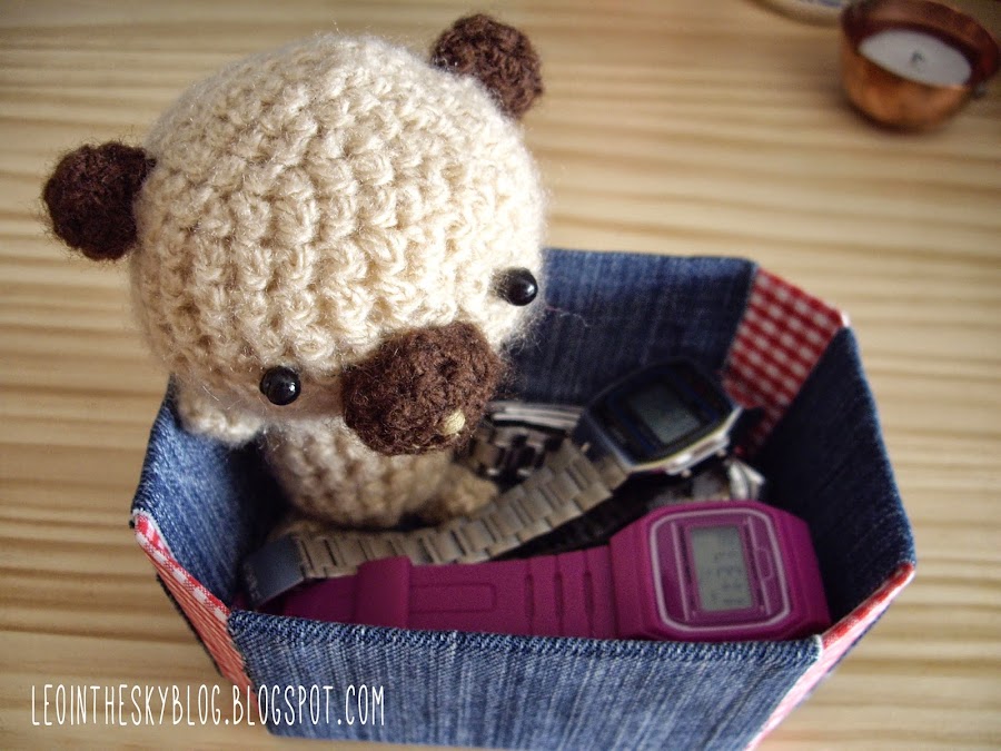 Me ha gustado tanto que está en mi escritorio. La uso para guardar los relojes y para custodiarlos está este osito que hice hace mucho tiempo a ganchillo y que me encanta...¡por fin tiene casita! :P