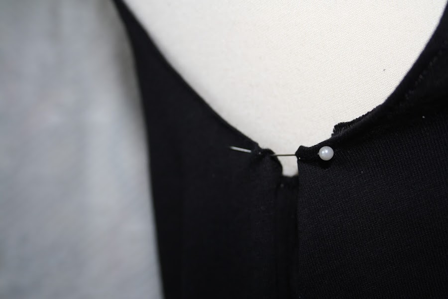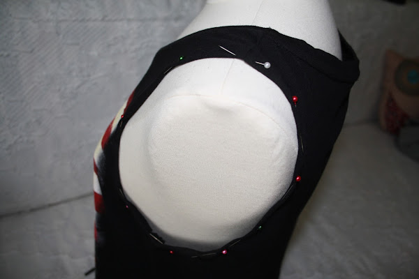 Como la sisa era muy grande, le hice una pinza tal y como veis en la foto. La idea era hacerle un pequeño globo debajo de la manga. Asi que sujeté con un alfiler y le dí una puntada de un lado a otro.