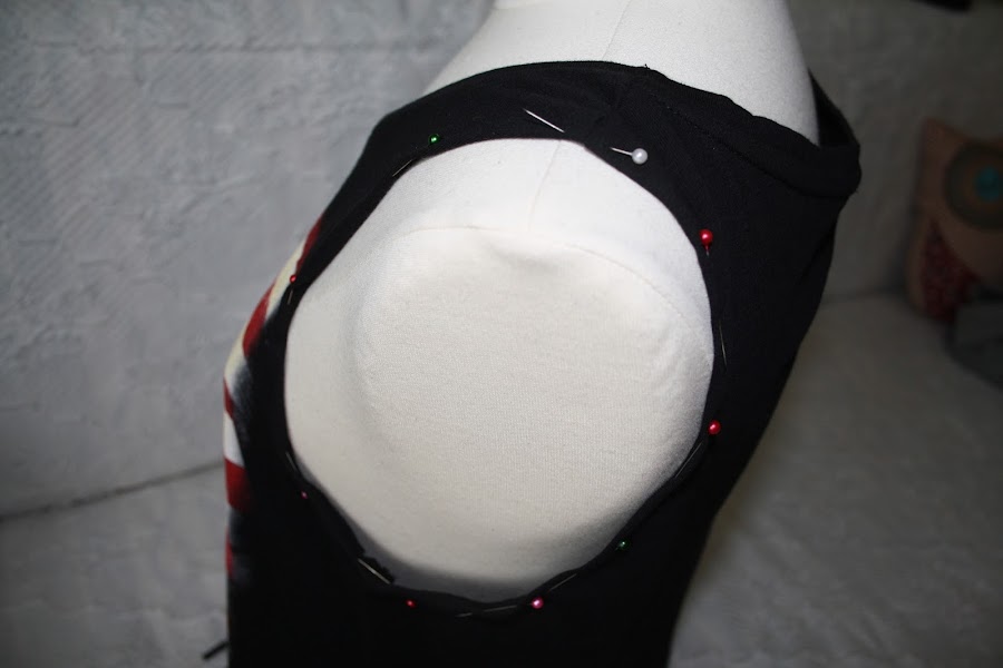 Como veis que era holgada, lo primero que hice fue cortarle las mangas, hilvanar con alfileres y coser a máquina. Si os sirve de ayuda marcad las mangas con tiza antes de cortarlas y comparad una con otra, así quedarán ambas iguales y no os llevaréis ninguna sorpresa desagradable.