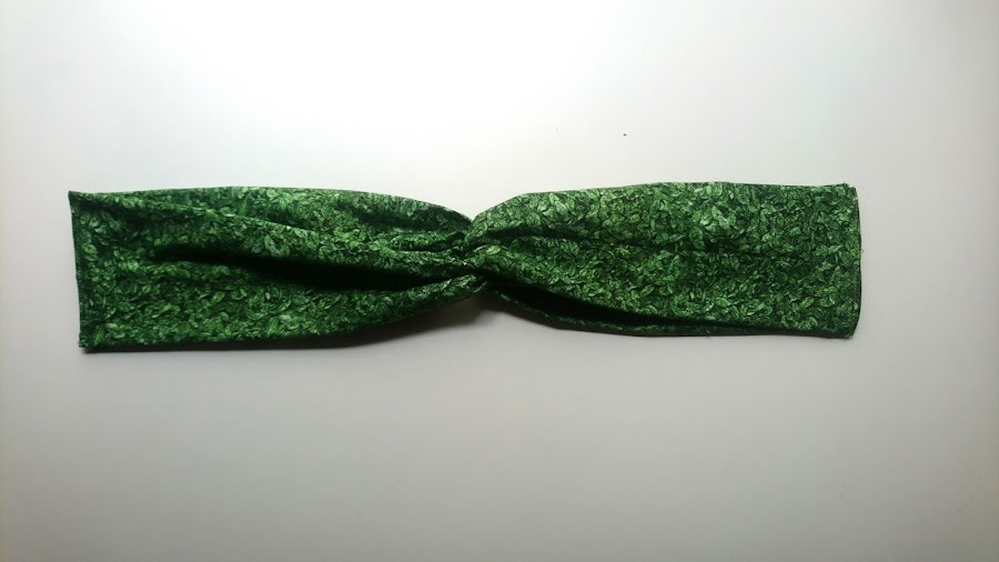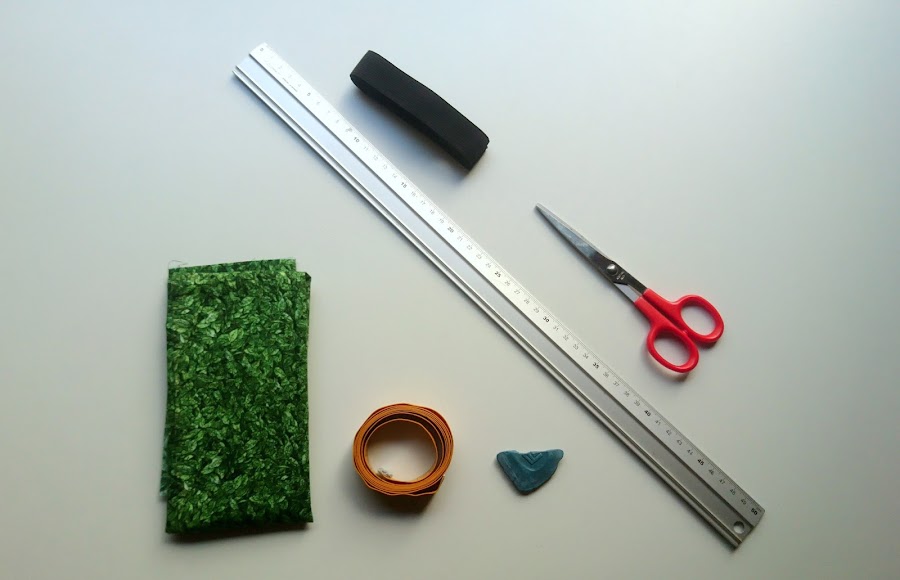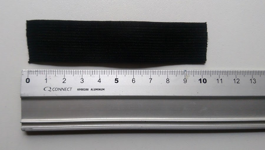 Una vez acabadas estas dos partes, las apartamos para hacer la pieza elástica que nos ajustará el turbante a la cabeza, para ello cortamos un trozo de goma de 10.5 cm y otro de tela de 16x6 cm.