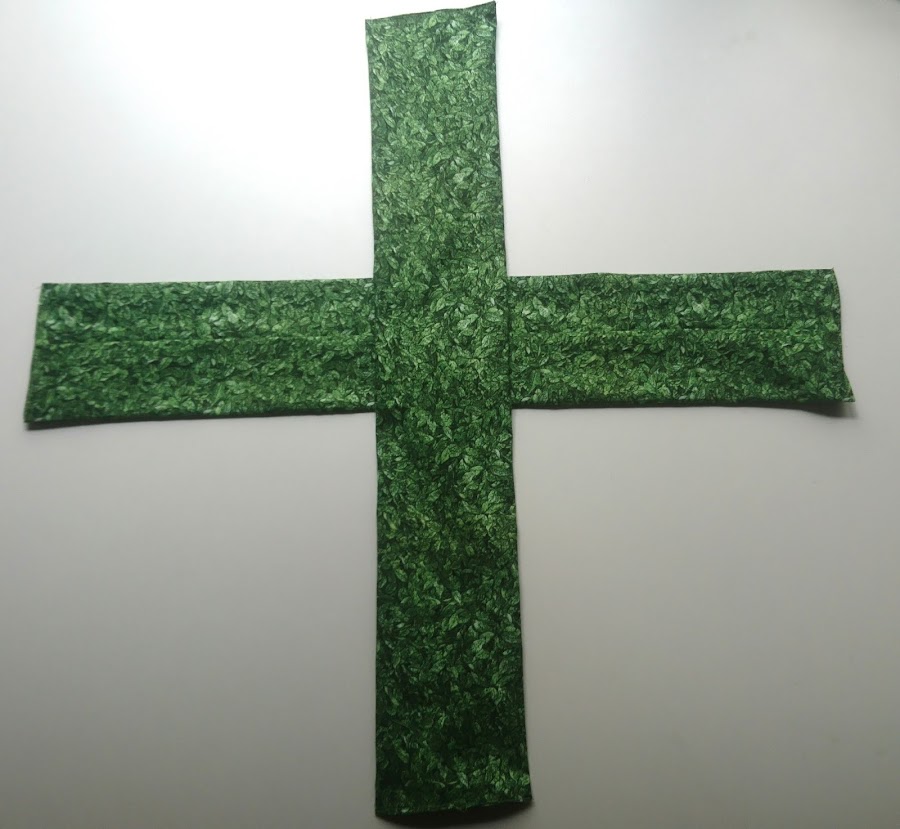 Damos la vuelta a las dos primeras piezas y las colocamos en cruz con las costuras enfrentadas, la de la pieza que está debajo hacia arriba y la que está arriba con la costura hacia dentro y las doblamos de forma que queden unidas por el centro entre ellas para coser los extremos.