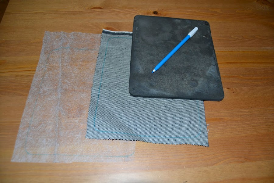 Una vez desenganchada la tela antigua, marcamos la forma de la alfombrilla en la entretela y la tela que vamos a utilizar.