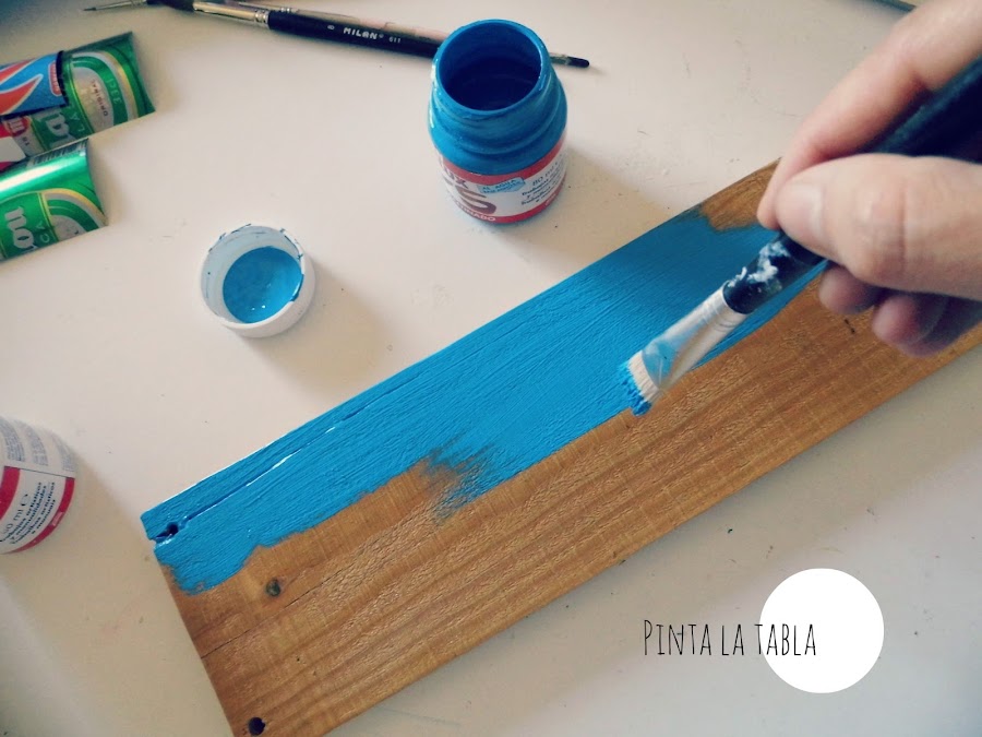 La tabla la tenía preparada del primer D.I.Y. Reinventa, si no es tu caso, tendrás que cortarla, lijarla y hacerle unos agujeros pasantes con el taladro y una broca pequeña.