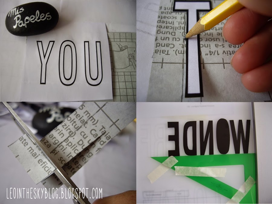Primero imprimí por duplicado la frase que quería poner, como era a un tamaño de letra bastante grande, algunas palabras las tuve que dividir e imprimir en dos hojas. Una cosa a tener en cuenta es elegir una fuente lo más simple posible, ya que luego hay que recortar las letras.