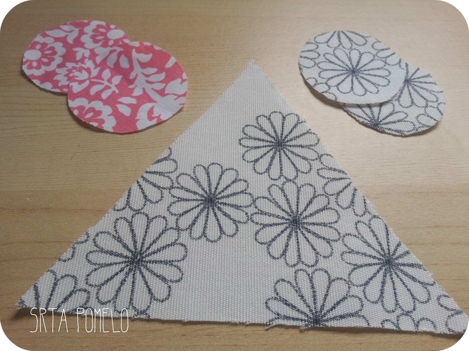 Cortamos un triángulo equilátero de 14 cm de lado, dos círculos del mismo tipo de tela de 2,5 cm y otros dos círculos del mismo tamaño de otra tela diferente. Cosemos dos círculos de cada tela enfrentando derecho con derecho, dejando un hueco para darle la vuelta. Le hacemos unos pliegues en la base y cosemos.