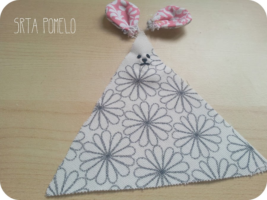 Colocamos las orejitas a ambos lados de la carita bordada en la esquina del triángulo, con la parte rosa hacia abajo, y las sujetamos con alfileres.