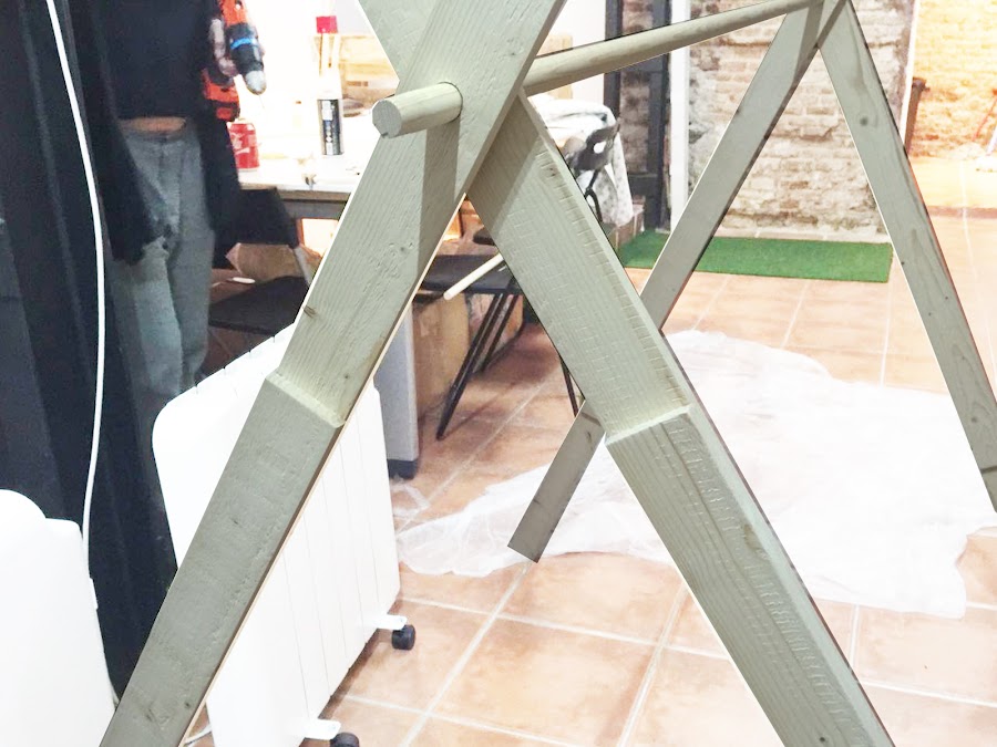 5. Atornilla o clava los palos redondos largos en los extremos inferiores de los tablones. Ya tenemos nuestra estructura plegable.