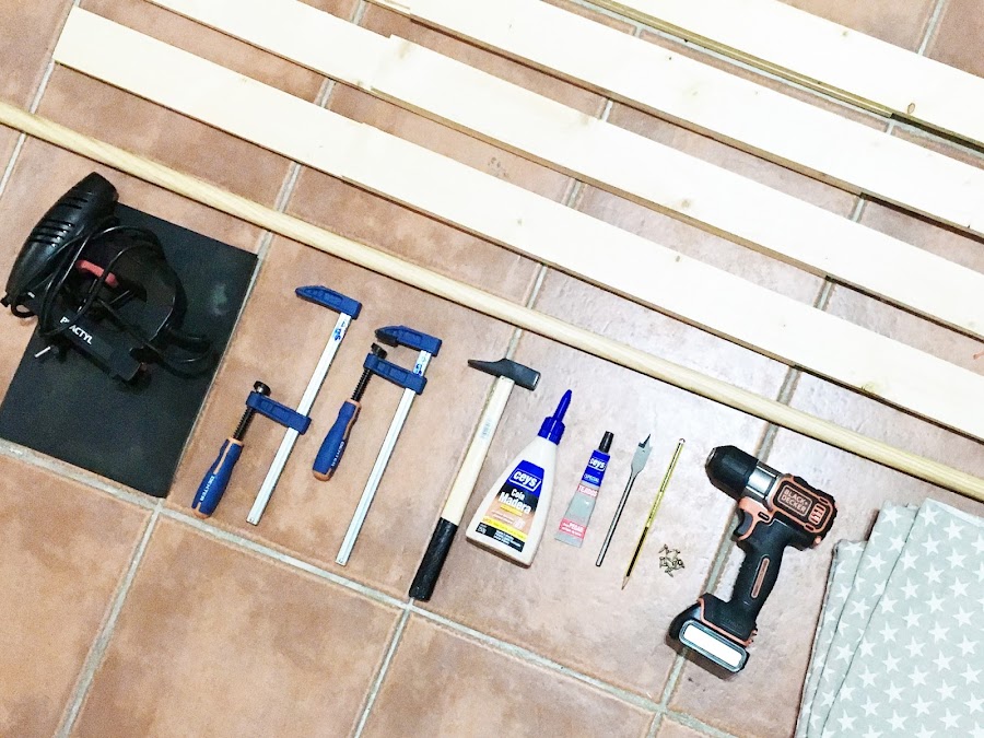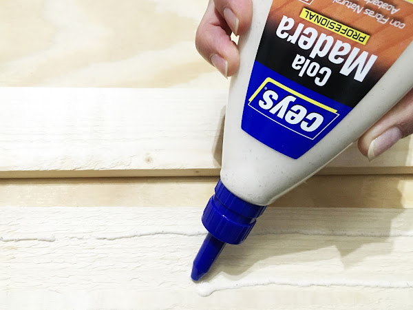 1. Como las maderas que tenía por casa no eran lo suficientemente largas (medían unos 80 cm), he unido varias con ayuda de la cola de madera Ceys y un par de gatos. Si vuestras maderas son del tamaño que queréis, este paso no os hace falta.