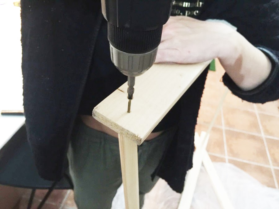 4. Une todas las madera pasando el palo redondo largo (el de 1,3m) por los agujeros que hemos hecho en la parte superior de los 4 tablones, 2 a cada lado. IMPORTANTE: no las peguéis para que el teepee sea plegable.