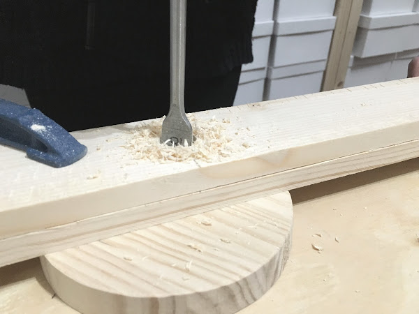 2 . Realiza un agujero en los 4 tablones de madera, todos a una misma altura, a unos 20 cm del borde. Para asegurarte de que encajan, puedes hacerlos de dos en dos, sujetándolos con un gato. Recuerda poner una base de madera extra entre las tablas y tu mesa para que no la estropees si se te va un poco la mano con el taladro.