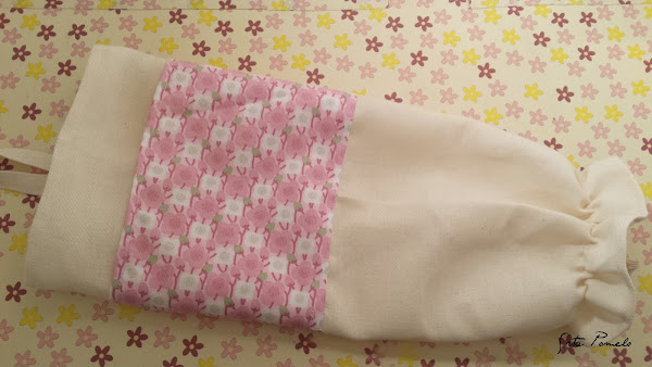 Finalmente, con un trozo de tela lisa de unos 5x10 cm, hacemos una especie de asa y la cosemos a la bolsa de tela justo por donde hemos unido sus extremos (por la costura).