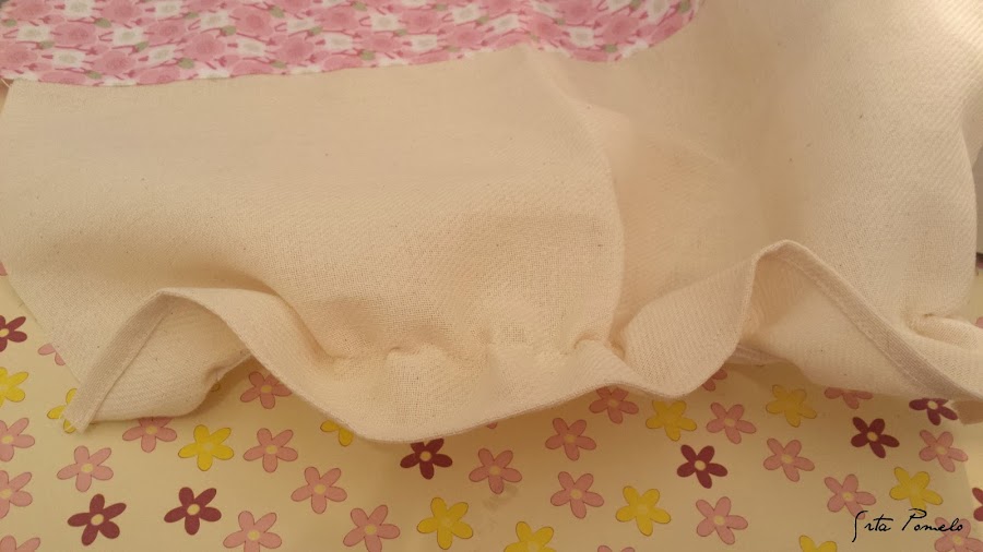 En el extremo inferior de la tela lisa, por su revés, cosemos un elástico, estirándolo a medida que lo vamos cosiendo para que la tela quede rizada al final.