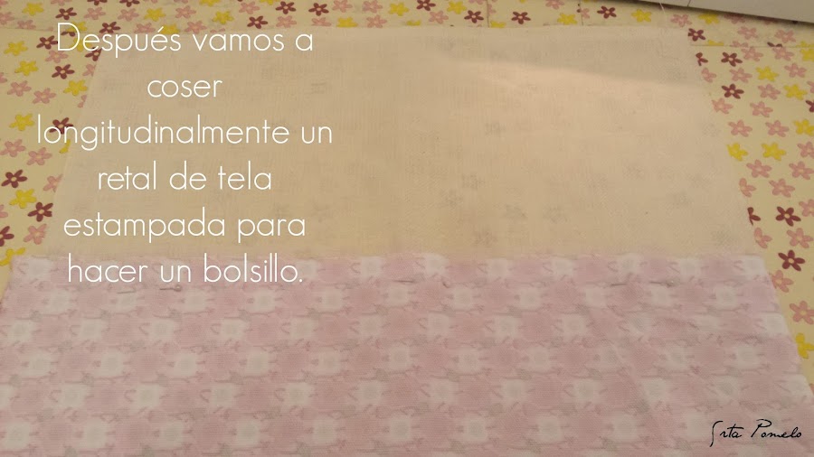Después, vamos a coger la tela estampada y la vamos a colocar sobre la tela lisa longitudinalmente (como veis en la foto), enfrentando derecho con derecho, es decir, la tela lisa estará del derecho y la estampada estará del revés. Afianzamos con alfileres y cosemos a todo lo largo con pespunte recto.