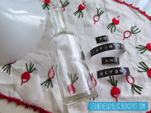 Una vez elegida la botella, la lavamos bien , le quitamos las etiquetas con agua muy caliente y la dejamos secar. Mientras podemos ir pensando en la frase que queremos poner, en mi caso lo tenía claro: "To Infinity and Beyond", ya sabéis lo que repetía una y otra vez Buzz Lightyear en Toy Story, que traducido sería: "Hasta el infinito y más allá". Así que como lo tenía muy claro me puse a teclear en mi máquina etiquetadora cada palabra.