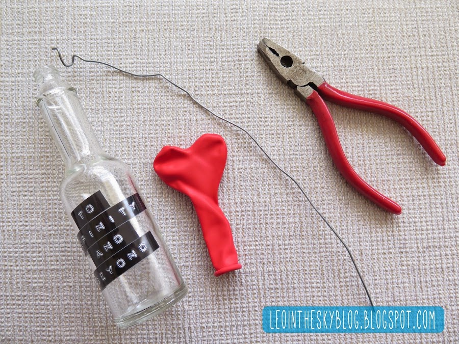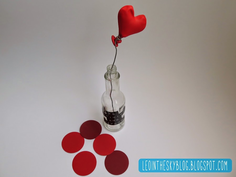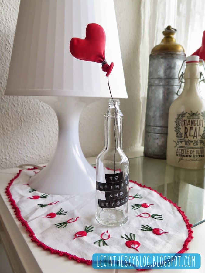 Después pegué con cuidado las palabras sobre la botellita y en principio ya estaría terminada la botellita con mensaje. Entonces me surgió una duda, ¿le pongo una flor?, ¿un pequeño pompón pegado en una ramita?, ¿hago una flor de papel? y en esas estaba cuando de pronto me encontré con un globo con forma de corazón y lo tuve claro clarísimo.