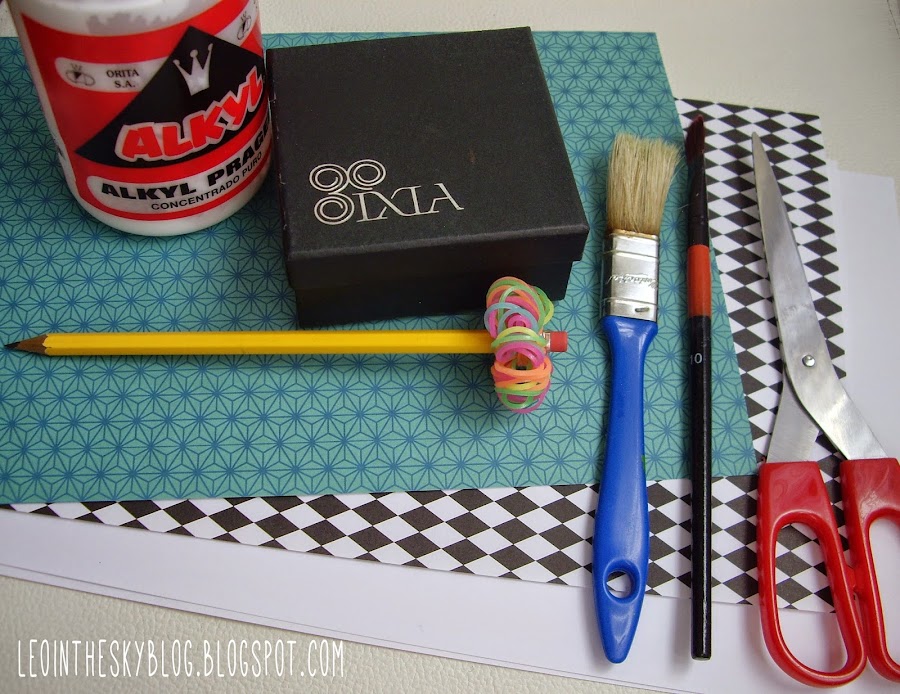 Materiales: una caja, papeles de colores (los que yo usé son de Tiger), alkil o cola blanca diluida, tijeras, lápiz, pincel para extender el alkil o la cola y foam (no aparece en la foto)