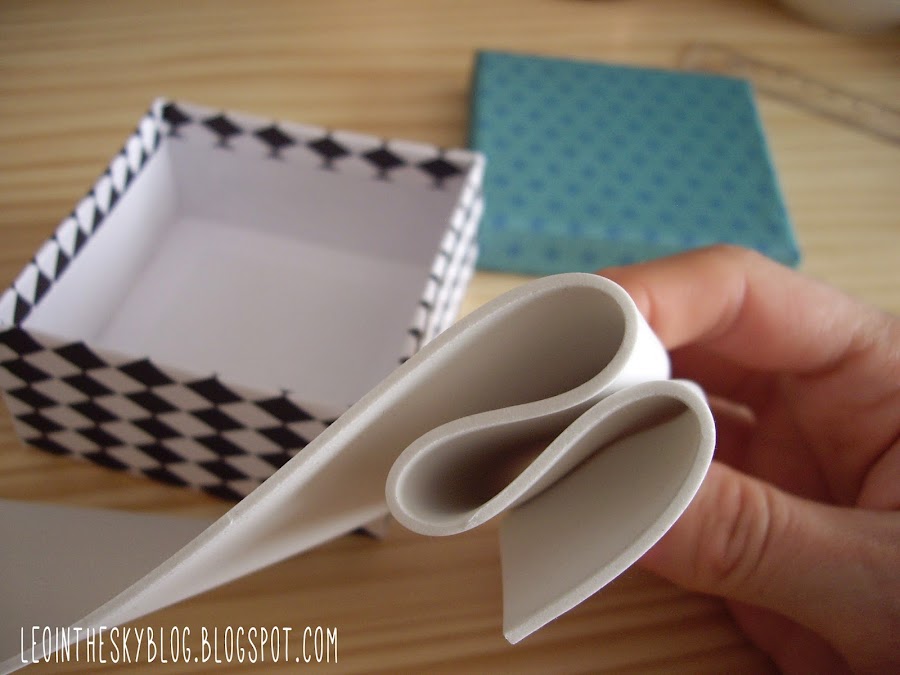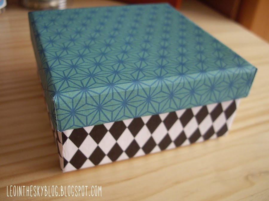 Después forramos la caja por fuera, yo decidí darle un toque digamos..¿nórdico? y utilicé papeles con distintos estampados para la tapa y la base.