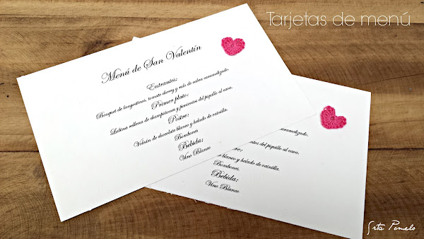 Y ahora os dejo un adelanto más....se trata de las tarjetas de menú. Están hechas con papel grueso para acuarelas, tipografía elegante impresa y también el detalle de los corazones de crochet.