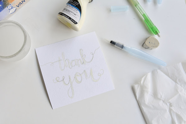 He recortado un trocito de papel de acuarela de 13x13cm y he dibujado con lápiz las letras. Así las podemos centrar bien y corregir alguna línea fácilmente si nos queda bien a la primera.