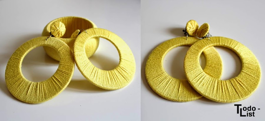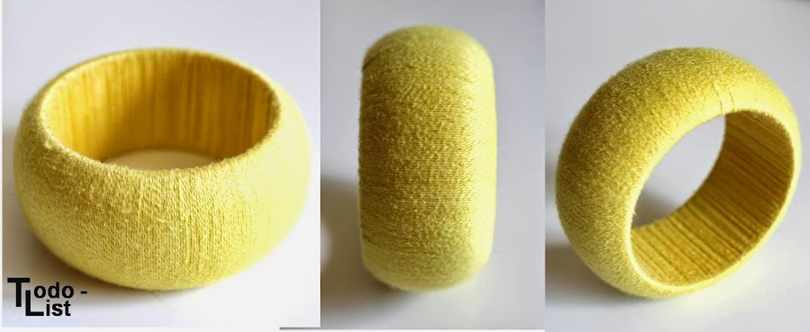 2) Al año siguiente quería un cambio de color para el vestido y me gustó la idea de combinarlo con amarillo. Cogí una pulsera que tenía de madera por casa y la forré con hilo de crochet amarillo.