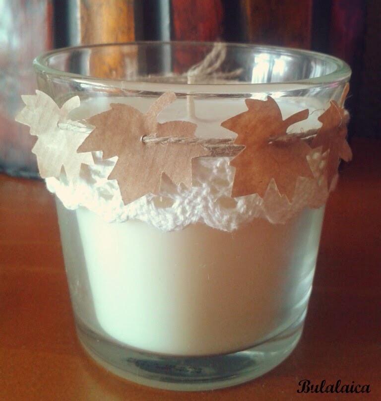 Pegué el Lace Tape al portavelas de cristal y coloqué encima mi cuerda adornada con las hojitas.