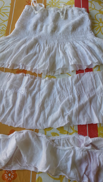 2). Medimos desde el bajo hasta la cintura y a la mitad cortamos.Separamos el vestido en 3 partes.Pasamos un zig-zag por las costuras.
