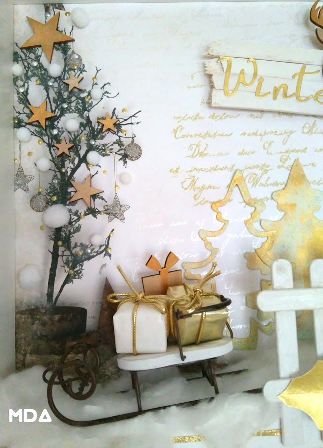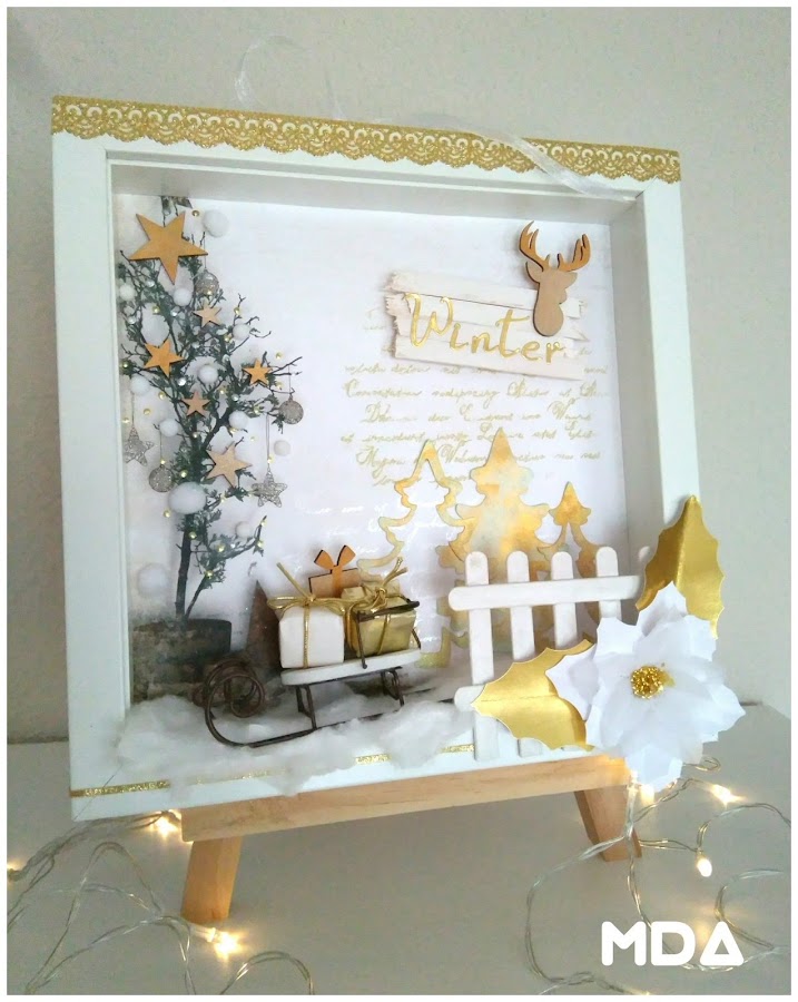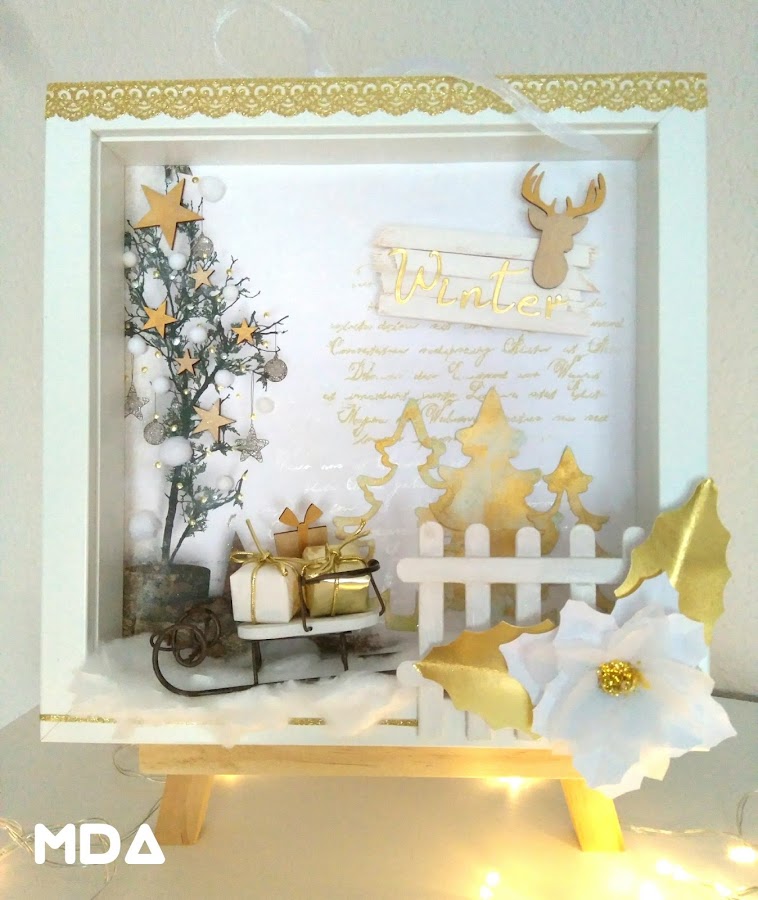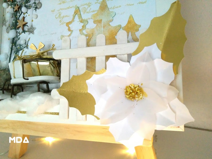 En este mismo marco ya hice otro diorama de primavera y la valla de madera que hice entonces, con palos de helado, la he seguido manteniendo aunque en esta ocasión la he decorado con una poinsettia realizada con cartulina dorada, papel y vellum en blanco. Resulta muy fácil hacer estas flores ayudándote de una troqueladora de círculo.