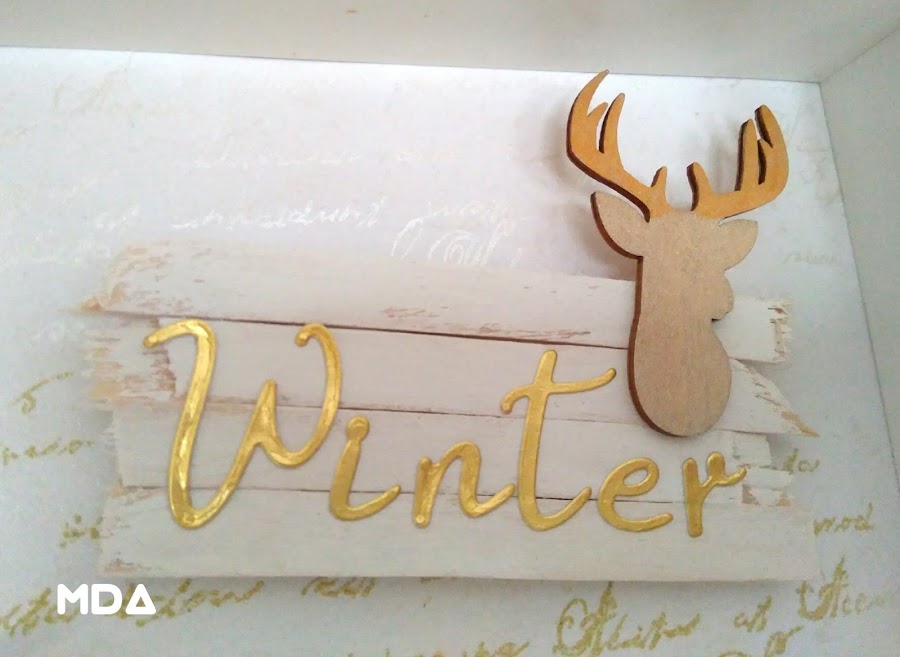 Siguiendo con los palos de helado, los he querido usar también para el cartel que da nombre a este proyecto "Winter" y que he pintado con acrílicos y decorado con un bonito ciervo en madera dorada de Simple Stories.