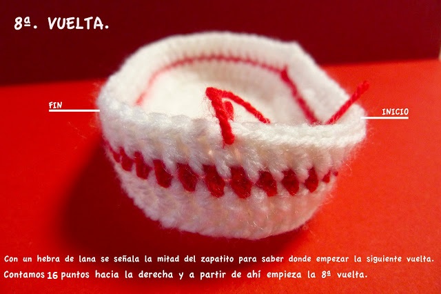 Ahora utlizaremos la lana roja para hacer la lengüeta del zapatito. Hacemos las 3 cadenetas iniciales y seguimos con 16 varetas más. En todas las vueltas haremos el mismo número de puntos y en la última vuelta se cierra con un punto enano. Total de vueltas 8. TOTAL PUNTOS EN CADA VUELTA:17.