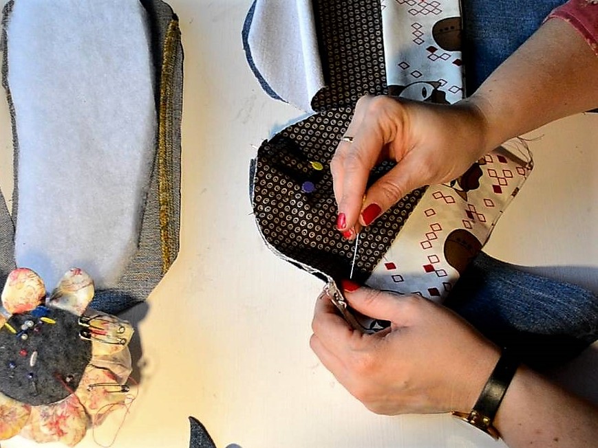 Una vez finalizadas las partes de arriba vamos a unir a una de las partes vaqueras, teniendo en cuenta que la tela de bolitas y zorritos es más grande pues ahí tenemos que meter el pie. Primero lo unimos muy bien con alfileres, si es necesario pasamos un hilván y luego pasaremos a la maquina un pespunte y también un zig-zag todo el borde.