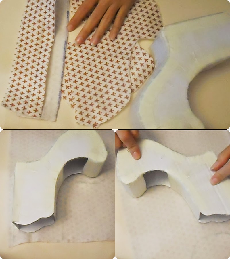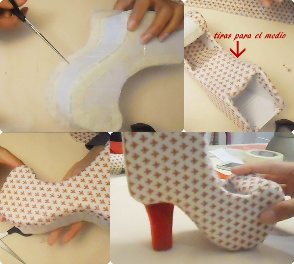 ahora vamos a forrando todo, y con las pestañas que haz dejado, aras pequeños cortes y pegaras todas las orinas, las tiras del medio si tendrán el mismo grueso que la base y esta tapara toda las pestañas de abajo. por ultimo pegaremos el tacón justo en el centro así tendrá mas firmeza ( como vez en la imagen)