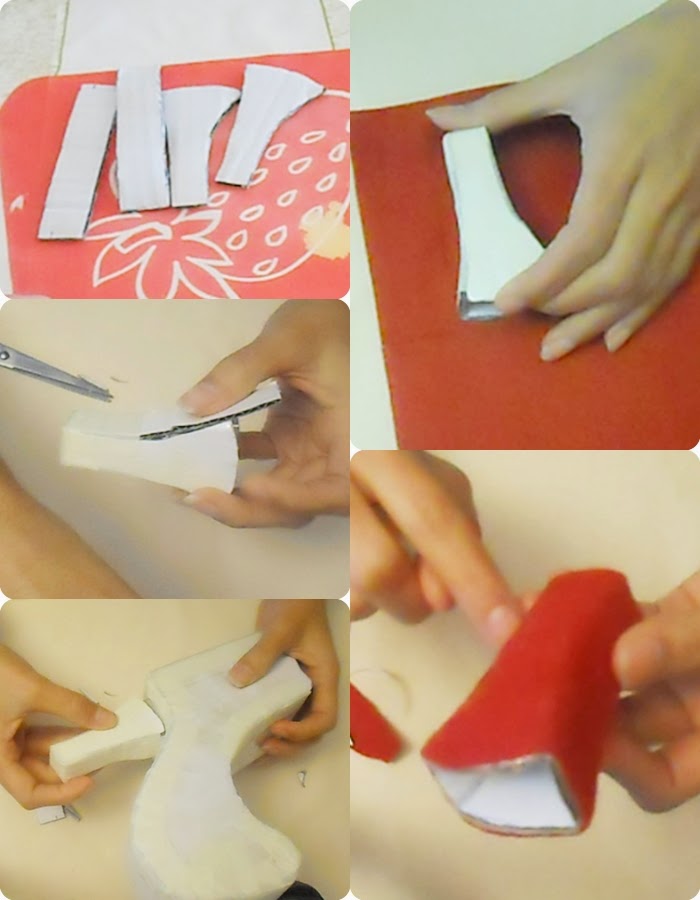 El tacón lo armaras de la misma manera que el zapato con cinta de papel o de carrocero, después lo forraremos haz un sola tira para que cuando pegues solo halla una linea de unión y lo are con fieltro rojo.