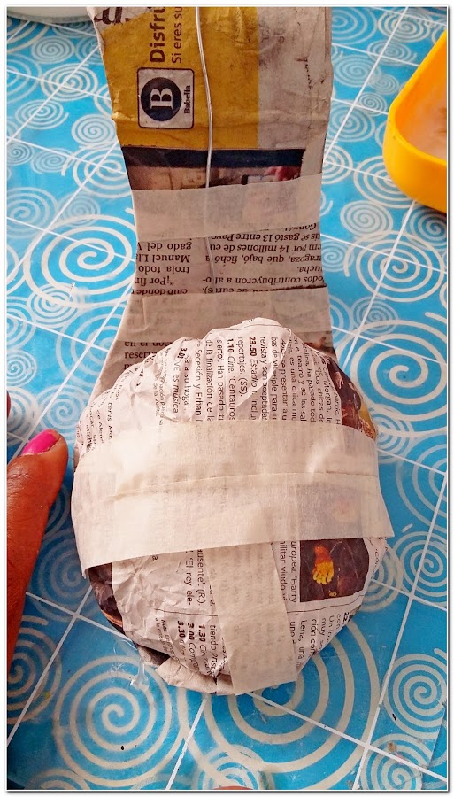 Colocado el tacón, empecé con la cartapesta en toda la parte de abajo y en la parte de arriba.