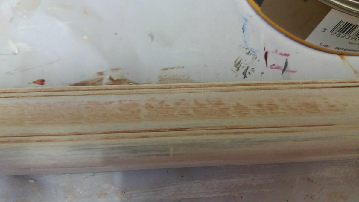 Seguidamente encolé las uniones del marco, asegurándolas después con unas puntas y enmasillé las partes que estaban desconchadas y abiertas con masilla para madera y Barrita Reparatodo de Pattex.
