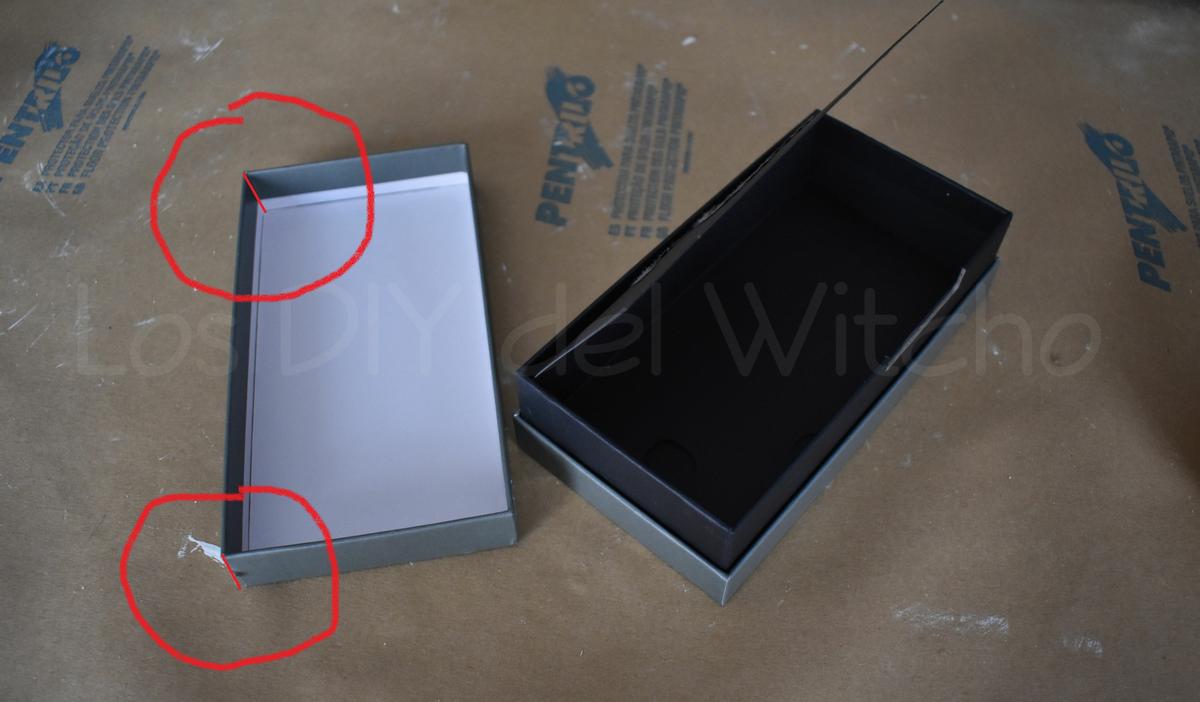 En este caso la caja y la tapa iban por separado, así que para unirlas únicamente debemos cortar uno de los laterales de la tapa por dos de las esquinas, siguiendo la linea que las forma