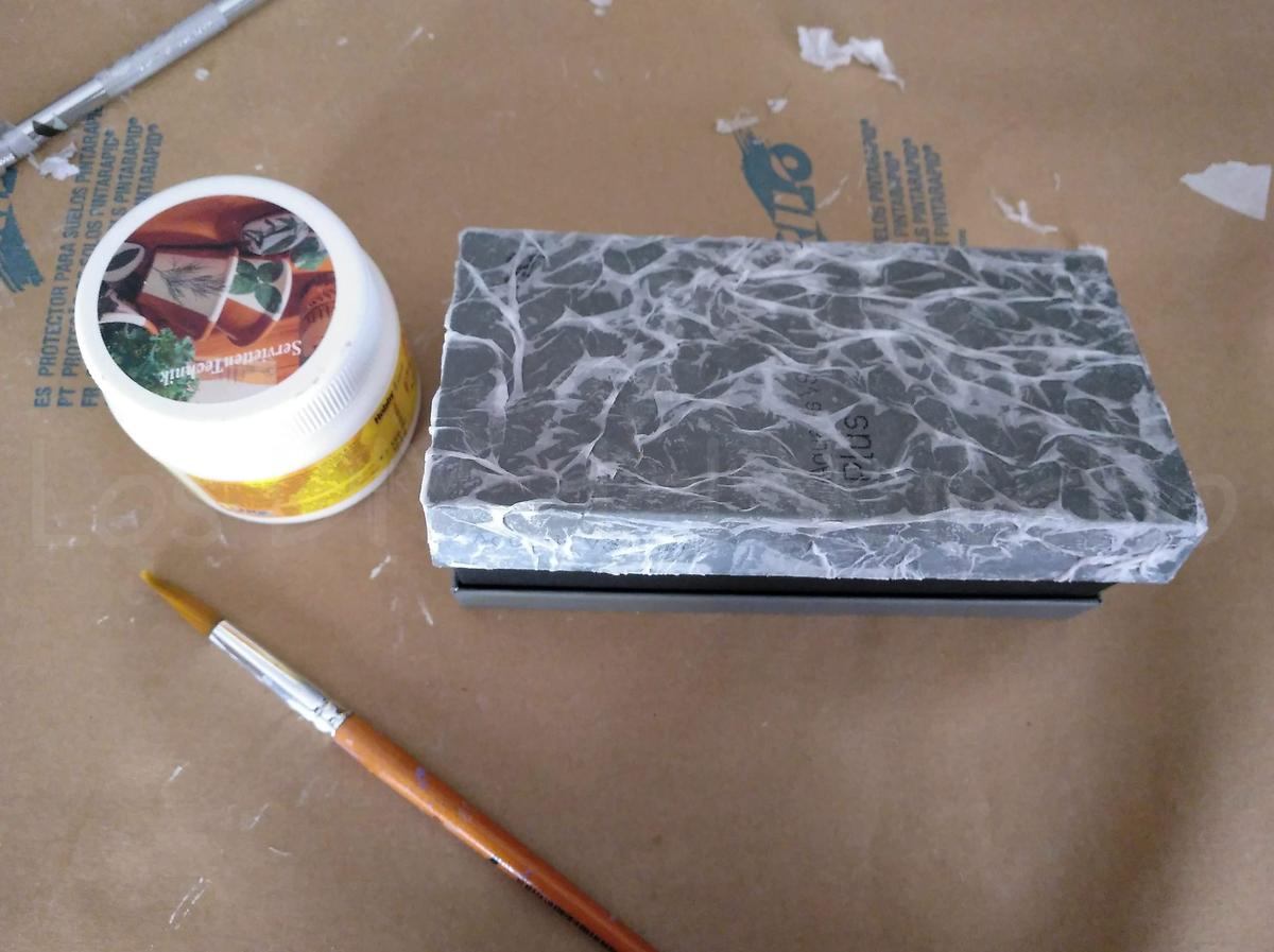 En el ejemplo de hoy, he utilizado el estuche de cartón de un móvil que iba dando tumbos por casa y con el que quiero mostraros cómo hacer una imitación de cuero, esta entrada por tanto forma parte también de la serie de Técnicas de Pintura 6.
