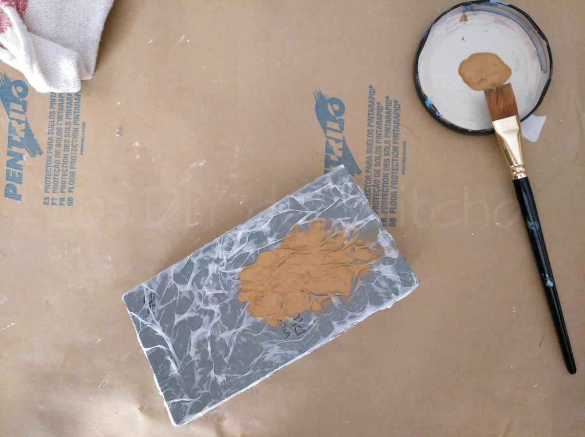 Para unificar el color de nuestra caja y que se asemeje al color del cuero, aplicaremos dos manos de Pintura Americana Honey Brown. Dejaremos secar entre ambas capas.