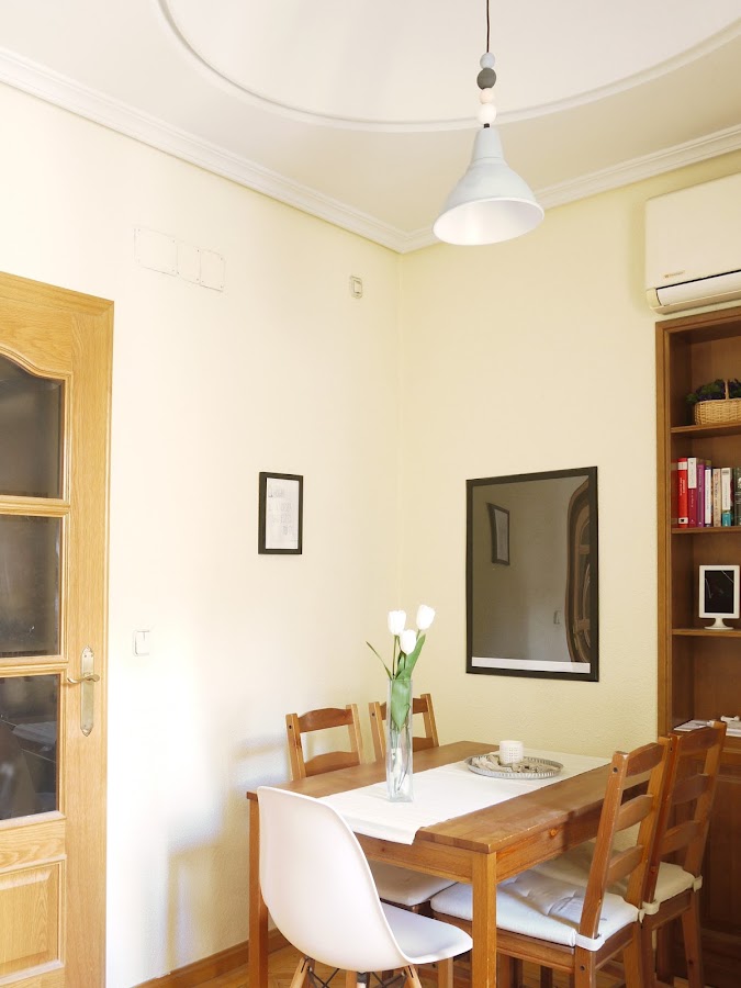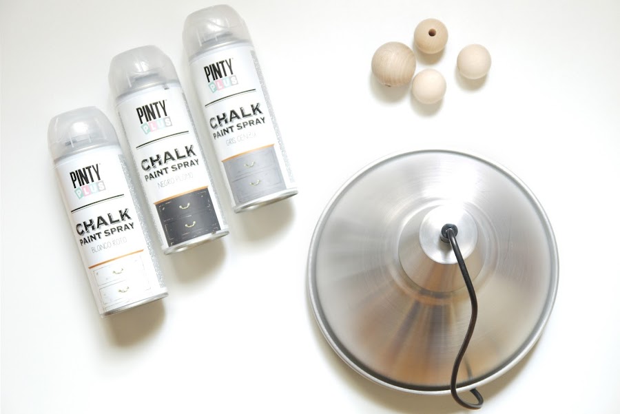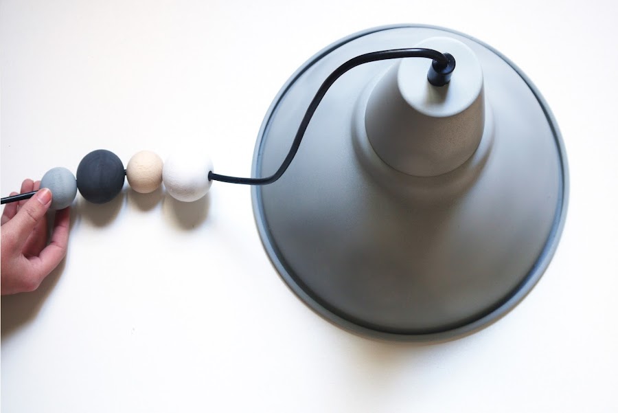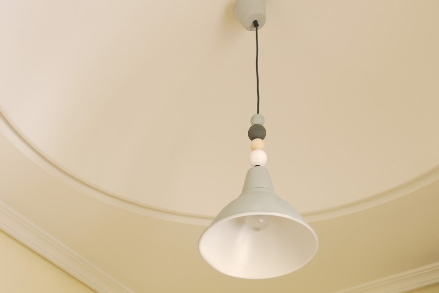 Una vez se hubieron secado todas las piezas, monté el conjunto. Simplemente hay que meter las bolas de madera por el cable de la lámpara hasta llegar a la tulipa. Me encanta cómo queda la calidez de las bolas de madera en contraste con la lámpara metálica.