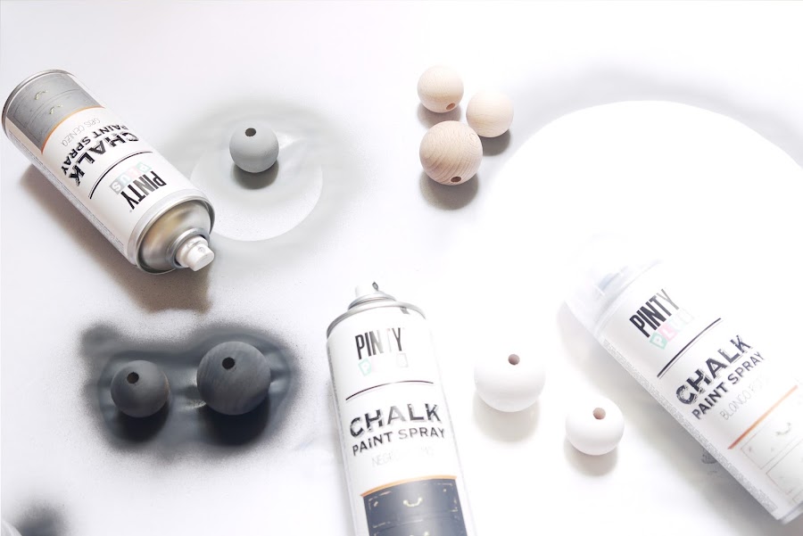 Mientras se secaba, he personalizado las bolas de madera con distintos colores: negro plomo, blanco roto y gris ceniza. También he dejado alguna al natural, que me gusta mucho el color de la madera.