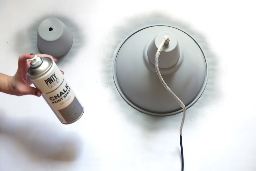A continuación, he pintado toda la superficie exterior de la lámpara y el aplique para el techo con un tono gris ceniza de chalk en spray. Me parece que es un punto a favor el hecho de que ahora la superficie sea mate y no brillante, aunque el color pueda parecer algo similar al original.