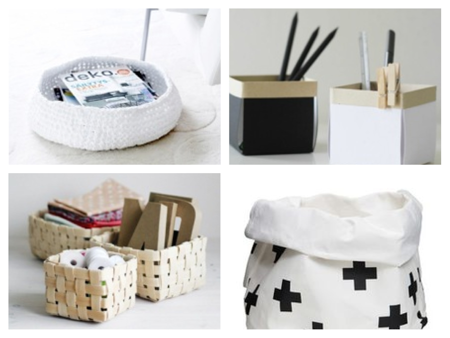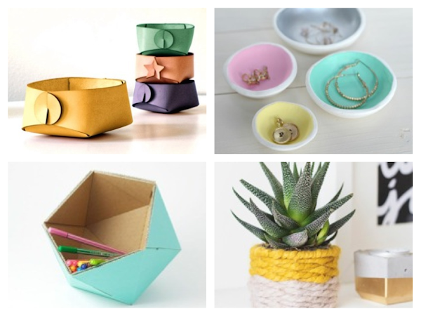 También podéis decantaros por utilizar otros materiales como el cuero, un poco de arcilla y decorarlas, un cuenco de cartón (puedes ver uno muy similar que te enseñé a hacer aquí y que también te sirve como lámpara) o incluso con una lata, cuerda y pintura te puede quedar un cesto muy mono, ¿no?