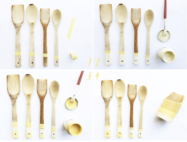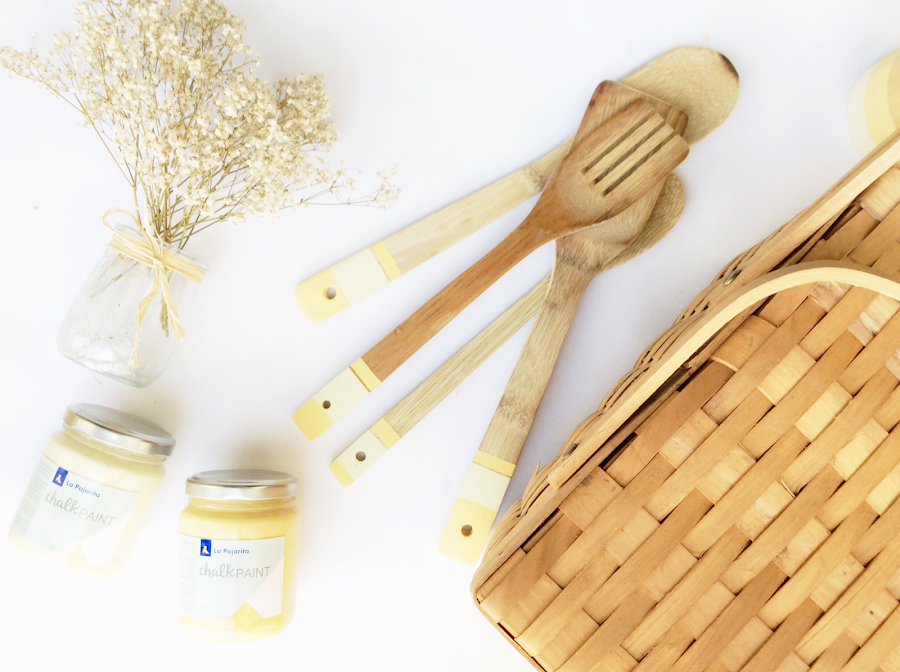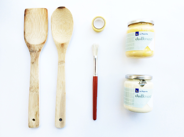 Lo que hace falta para este diy es: unos cubiertos de madera, un poco de washi, pincel y pintura. Yo he escogido una en dos tonos diferentes de amarillos y con acabado chalk de la Pajarita.