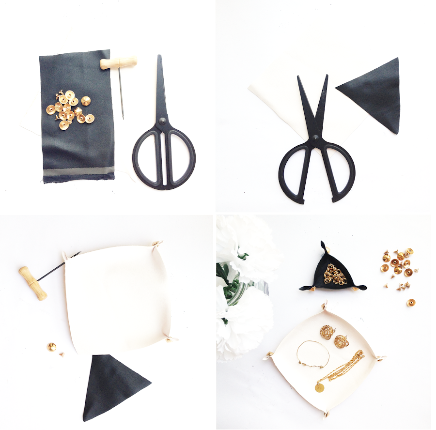 Yo he utilizado un par de trozos de cuero en blanco y negro, tijeras, tachuelas doradas de tornillos y una barrena, aunque también sirve una troqueladora o un sacabocados de los de agujerear los cinturones.