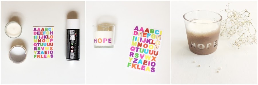 Otro material sobre el que podéis utilizar esta pintura es el vidrio. Podéis aplicar una imprimación base si queréis pero no es necesario. En este diy he vuelto a utilizar el recurso de las letras de pegatinas que os enseñé en el tutorial de los banderines. Esta vez he escrito la palabra HOPE sobre una vela y la he cubierto de marrón glacé.